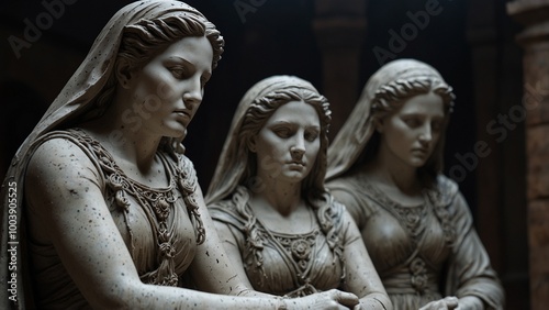 Naklejka premium A haunting statue of the Fates, three women weaving the threads of destiny, their expressions distant and ominous.