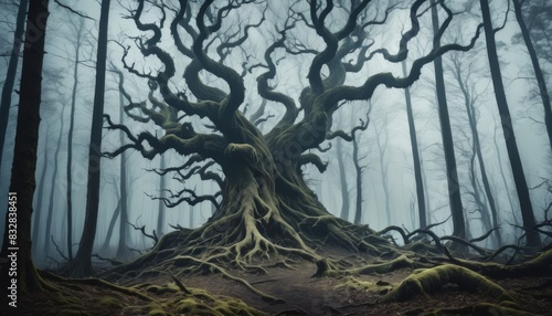 © Anastasiia, Naklejka premium A hauntingly beautiful ancient tree stands with sprawling twisted branches in a fog-enshrouded forest, evoking a mystical atmosphere.. AI Generation