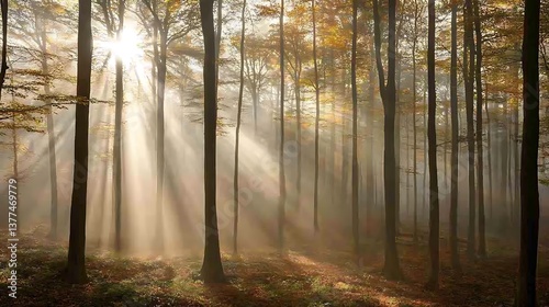 Naklejka premium A hauntingly beautiful forest shrouded in thick, ethereal mist, with sunlight breaking through in golden rays