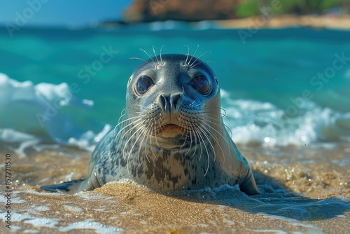 © Nico, Fototapeta premium A Hawaiian monk seal basking on a sandy beach, its sleek body glistening in the sun and the turquoise ocean waves crashing behind it.