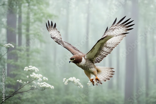 © Toseef, Obraz premium A hawk with pale green leaves and delicate white flowers, AI Generated