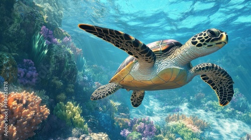 © anis rohayati, Obraz premium A hawksbill turtle swims on a coral reef in the sunlight, background wallpaper AI generated image