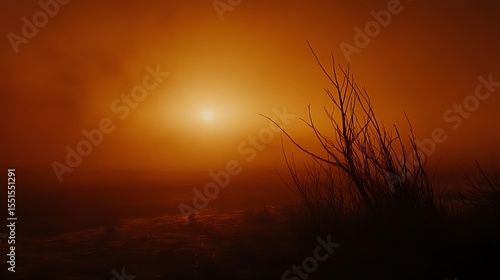 © Alfariha, Fototapeta premium A hazy, orange sunrise casts long shadows on silhouetted branches and a misty landscape. The sun is barely visible through the dense fog
