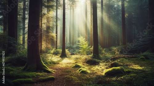 © ArtStage, Obraz premium A hazy picture of a forest with sunlight filtering AI generated illustration