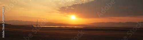 Naklejka premium A hazy sunset over a vast field with distant mountains in the background.