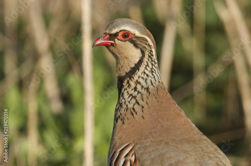 Fototapeta premium A head shot of a pretty Red-Legged Partridge, Alectoris rufa, searching for...