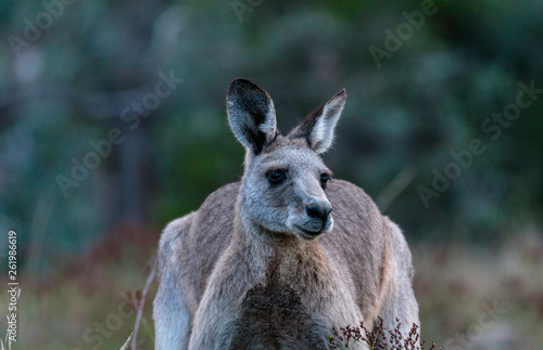 © Jon Steinbeck, Fototapeta premium A head view, rightside, of a male Eastern Grey Kangaroo at Red Hill Nature Reserve, Canberra, Australia during the morning of April 2019