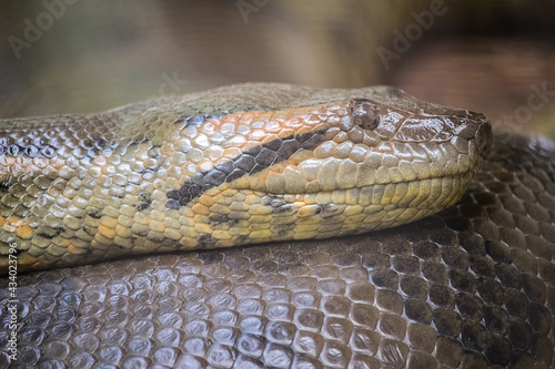 © ZPOT, Obraz premium A headshot close-up of Green Anaconda (Eunectes murinus) in zoo enclosure.