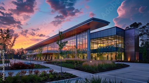 Obraz premium A healthcare facility with a facade that integrates natural materials and energy-efficient systems, highlighting the importance of sustainability in healthcare architecture.