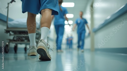 Fototapeta premium A healthcare worker in scrubs walks down a hospital corridor, emphasizing...
