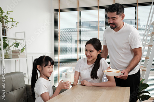 © tigercat_lpg, Fototapeta premium A Healthy Asian Thai family, daughter, and young mum drink fresh white milk in glass and bread from father, joy together at a dining table in morning, wellness nutrition home breakfast meal lifestyle.