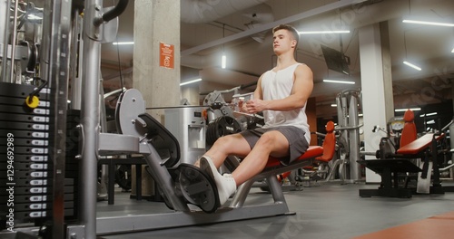 Fototapeta premium A healthy young man of European appearance is engaged in an exercise machine,...