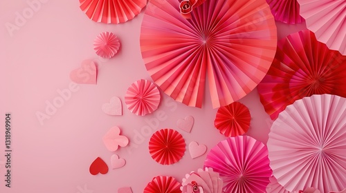 Naklejka premium A heap of gentle pink and red hearts formed by Chinese paper fans are flying on a soft pink color background, serving as an eye-catching header. The delicate hearts, with their charming pink and red