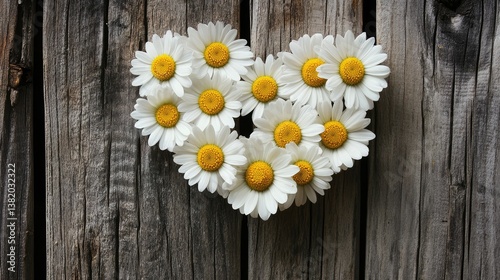 © Natchooda, Fototapeta premium A heart-shaped arrangement of white daisies with bright yellow centers, set against the textured, weathered wood of an old fence, creating a rustic and natural charm.