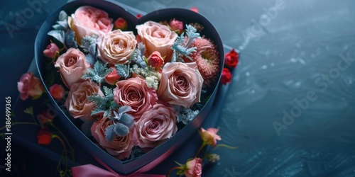 Fototapeta premium A heart-shaped box filled with fresh pink roses, perfect for romantic...