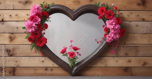 Fototapeta premium A Heart-Shaped Mirror on a Wooden Wall with Red and Pink Flowers, heart-shaped mirror, beautiful