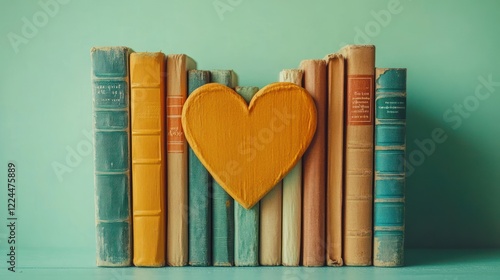 Naklejka premium A Heartfelt Collection: Vintage Books and a Wooden Heart