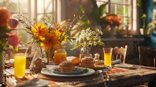Fototapeta premium A heartwarming Mother's Day brunch, with a beautifully set table filled with fresh flowers, pancakes, and orange juice. A mother smiles as her children surprise her with a handmade card.