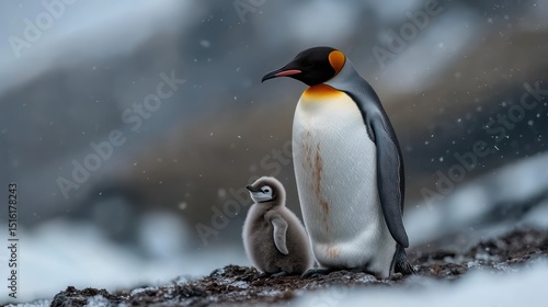Fototapeta premium A heartwarming scene depicting an emperor penguin standing proudly with its fluffy chick, surrounded by a snowy landscape that invokes feelings of family and protection.