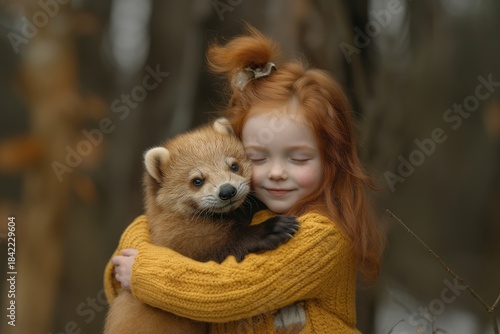 Obraz premium A heartwarming scene of a young girl with red hair embracing a small brown...