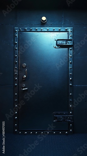 © Md Nurul, Obraz premium A heavy dark metal hatch with visible rivets and a locking mechanism illuminated by a single light