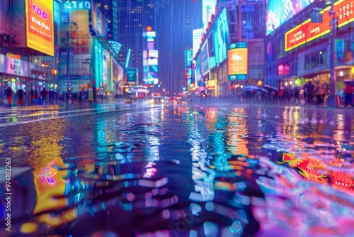 © Andrei, Obraz premium A heavy downpour turns the city streets into glistening rivers, reflecting the neon lights and creating a mesmerizing spectacle