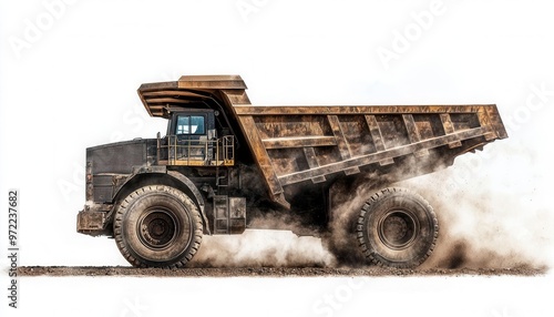 Obraz premium A heavy-duty dump truck kicks up dust while transporting materials on a construction site, showcasing industrial power and efficiency.