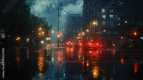 Fototapeta premium A heavy rainstorm over a city street, with reflections of streetlights in the...
