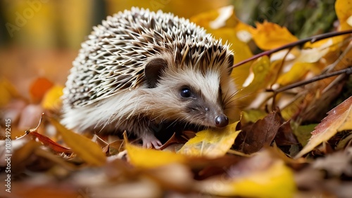Fototapeta premium A hedgehog forages in a vibrant autumn garden, surrounded by fallen leaves