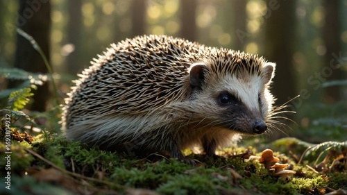 Fototapeta premium A hedgehog foraging for mushrooms in a sunlit forest, surrounded by lush greenery and soft light