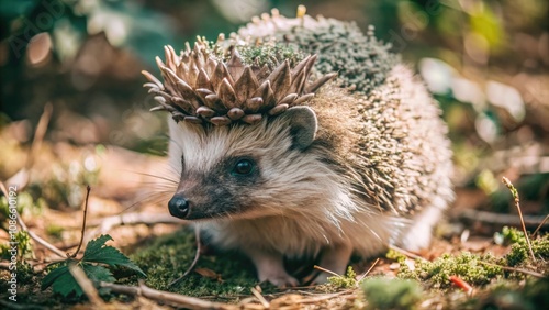 © arri, Naklejka premium A Hedgehog Wearing a Crown of Dried Leaves in a Forest
