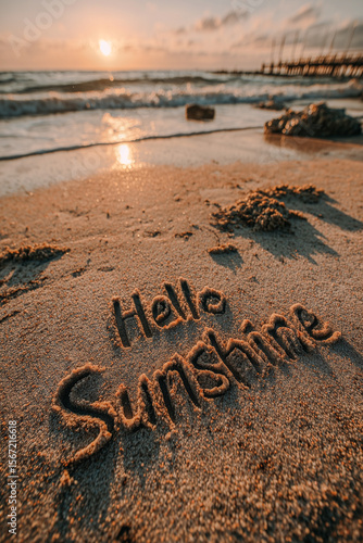 Fototapeta premium A 'Hello Sunshine' greeting drawn in beach sand with thin, natural lines, surrounded by a peaceful ocean view and soft pastel gradient sky under morning light.