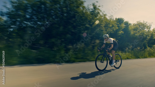 © stockcopter, Obraz premium A helmeted cyclist rides down a scenic road, surrounded by lush greenery. The motion blur effect emphasizes speed and intensity. Aerial view.