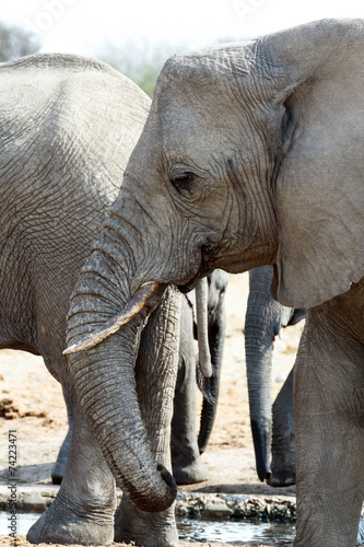 Fototapeta premium A herd of African elephants drinking at a muddy waterhole