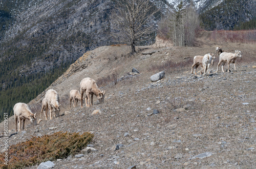 Fototapeta premium A herd of bighorn sheep (Ovis canadensis) grazing beside the highway near Exshaw, Alberta, Canada