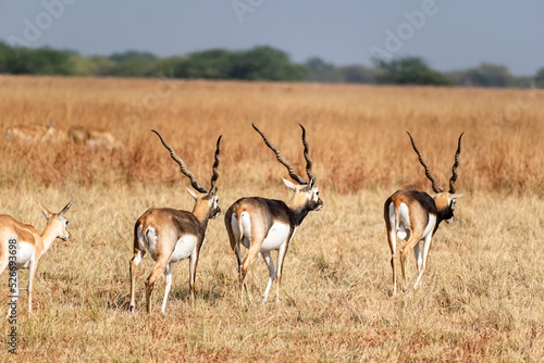 Naklejka premium A herd of blackbucks walking across the grasslands of the Velavadar National...