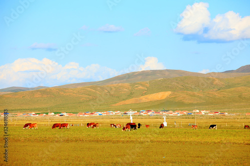 © zhengzaishanchu, Obraz premium A herd of cattle are eating grass on the grassland