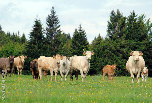 © tomas, Fototapeta premium A herd of cow grazing on lush green meadow with calf