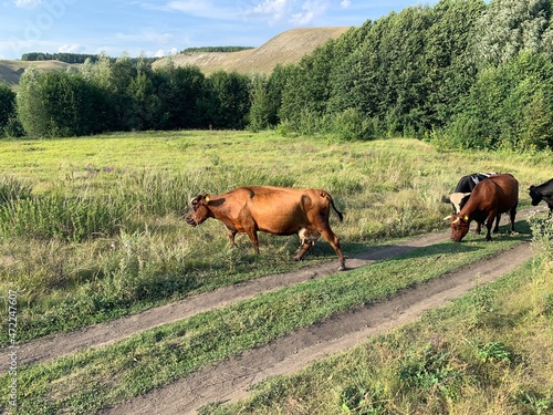 © Никита Родионов, Fototapeta premium a herd of cows walking along the road between the fields