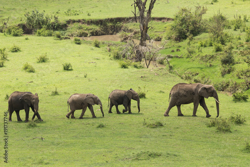 Fototapeta premium a herd of elephants moving across the grasslands of the Maasai Mara, Kenya