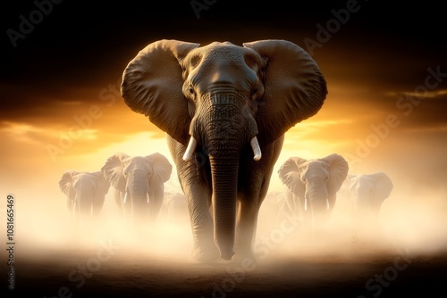 © Ilona, Obraz premium A herd of elephants walking across a dirt field