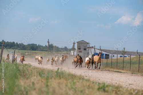Naklejka premium A herd of horses runs from the pasture to the ranch.