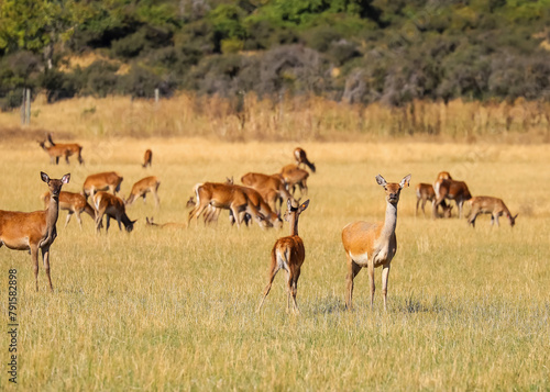 Fototapeta premium A herd of red deer grazing on a field of yellow grass, autumn on a farm