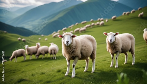 Obraz premium A Herd of Sheep Grazing on a Green Hillside