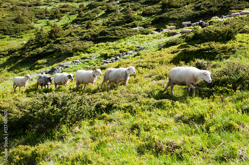 Obraz premium A herd of sheep on alpine meadows in Carpathians