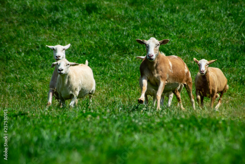 © bettys4240, Obraz premium A herd of tame Katadin Sheep in a green pasture.