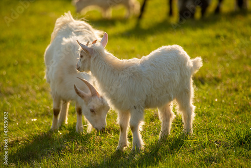 Obraz premium a herd of white goats grazing in the mountain meadow