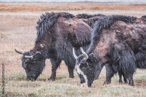 © Denis, Fototapeta premium A herd of yaks walks along the grassy valleys of the Pamir highlands against the backdrop of mountain ranges with snow, an animal in the Tien Shan mountains in cloudy weather