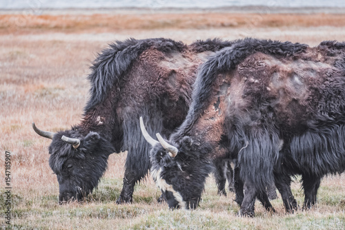 © Denis, Fototapeta premium A herd of yaks walks along the grassy valleys of the Pamir highlands against the backdrop of mountain ranges with snow, an animal in the Tien Shan mountains in cloudy weather