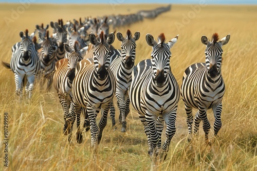 © kornc, Fototapeta premium A herd of zebras are walking across a field